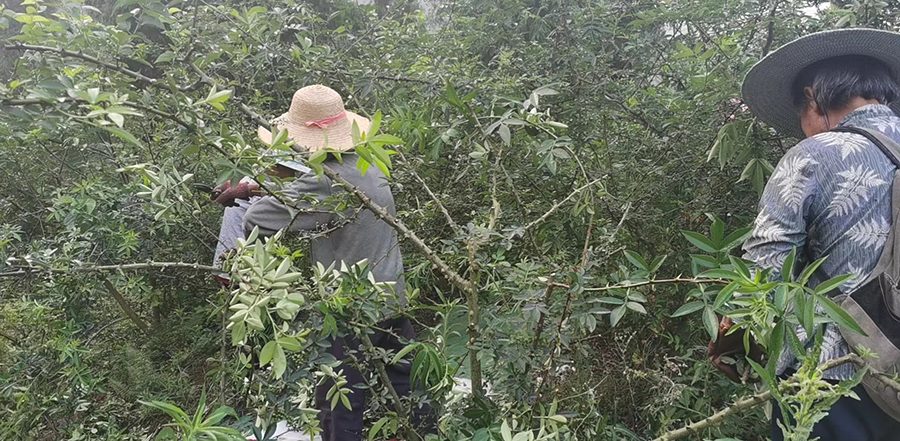 千久發(fā)的有機(jī)青花椒主要用于出口,對(duì)于品質(zhì)要求非常高,從青花椒的土壤環(huán)境、到生長(zhǎng)過(guò)程、再到采摘和生產(chǎn)加工,每一個(gè)環(huán)節(jié)公司都嚴(yán)格把控。青花椒的采摘方法很重要,必須晴天或陰天進(jìn)行,雨天或有露水時(shí)不能采摘,采摘時(shí)連果帶枝一并剪下,剪下來(lái)的枝需要輕放,避免碰撞和擠壓。否則極易出現(xiàn)油椒,影響花椒品質(zhì)。采摘下來(lái)的青花椒須當(dāng)天進(jìn)行烘烤。